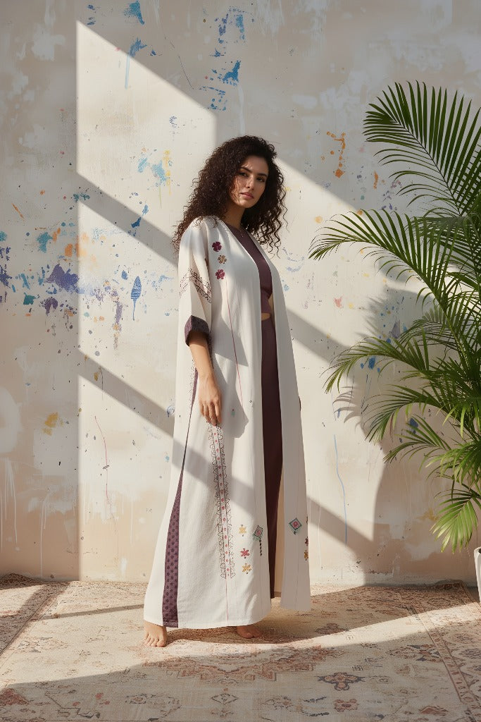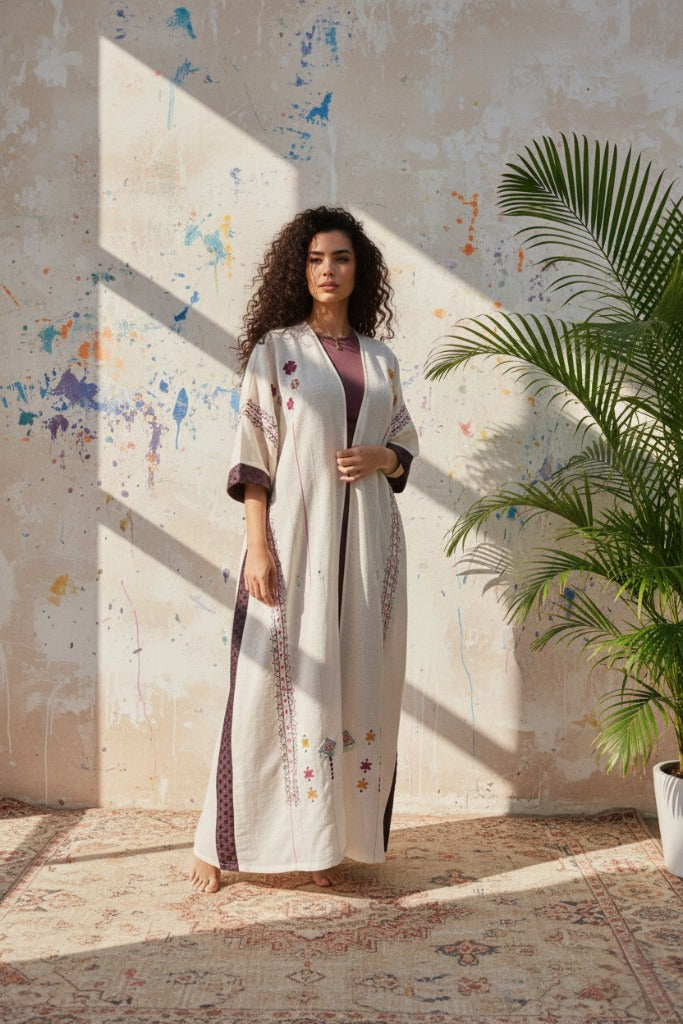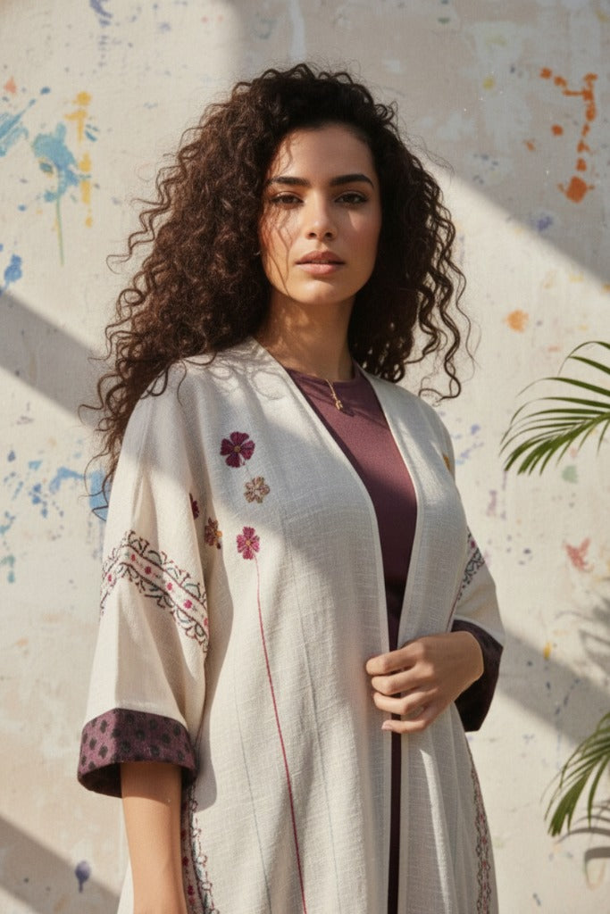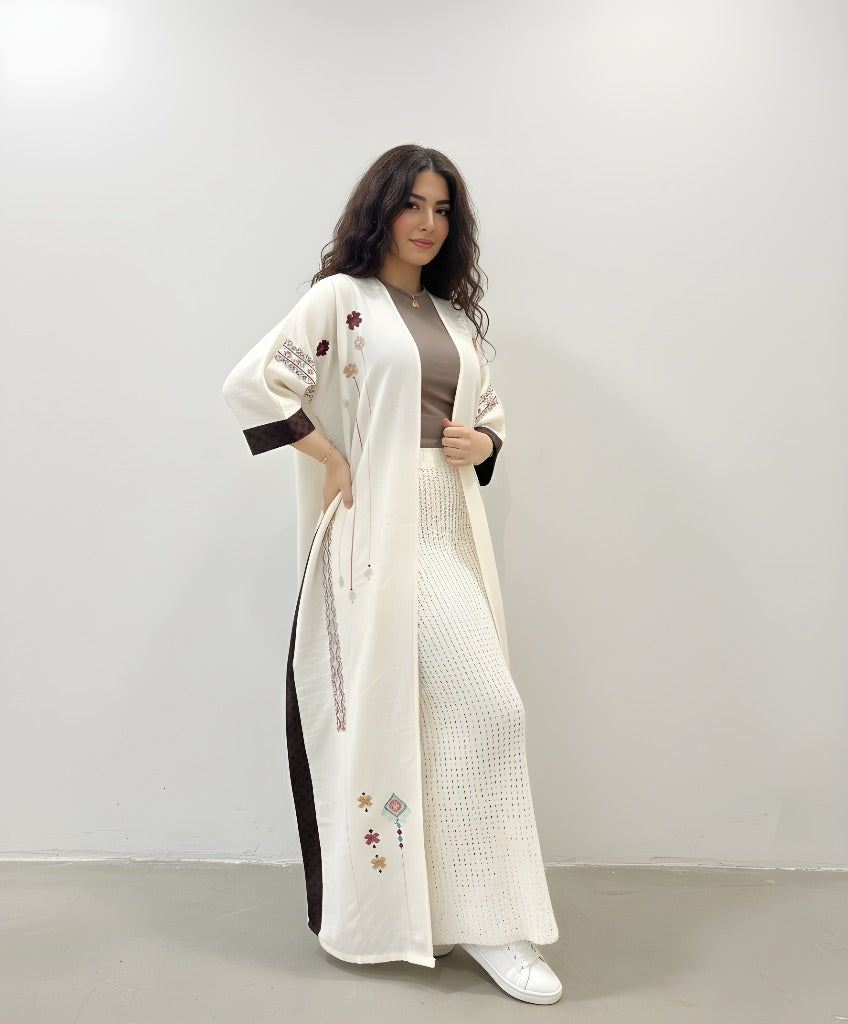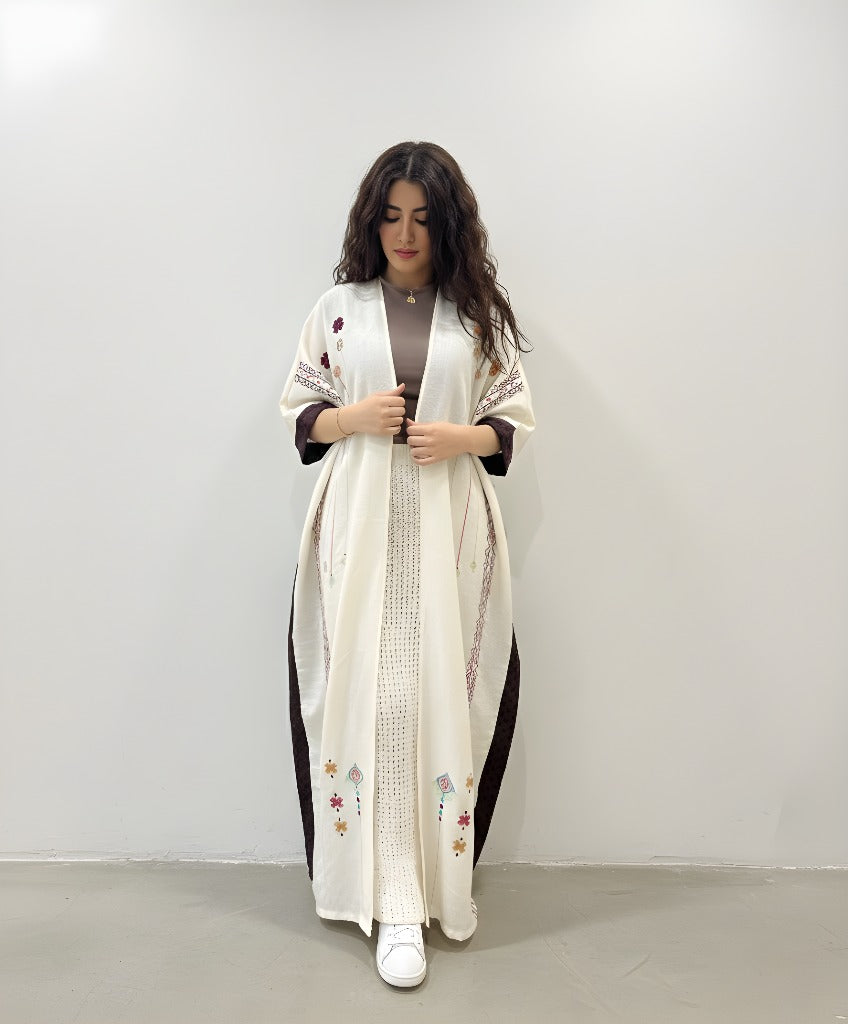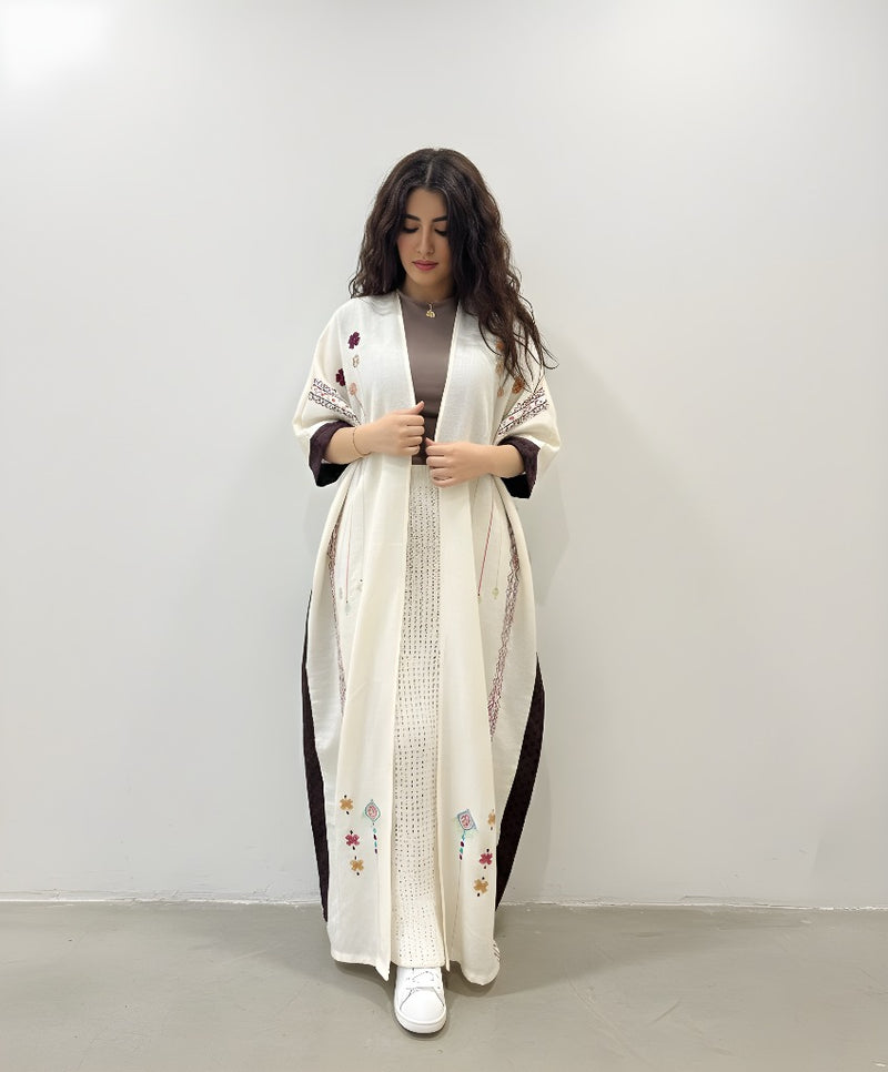 عباية فيها تفاصيل تحسسك إنك حاطة شي من مشاعرك فيها. القصّة ناعمة، والسكارف يكمل بهدوء. لبسة تقول “أنا هنا، بس براسي شي حلو.”