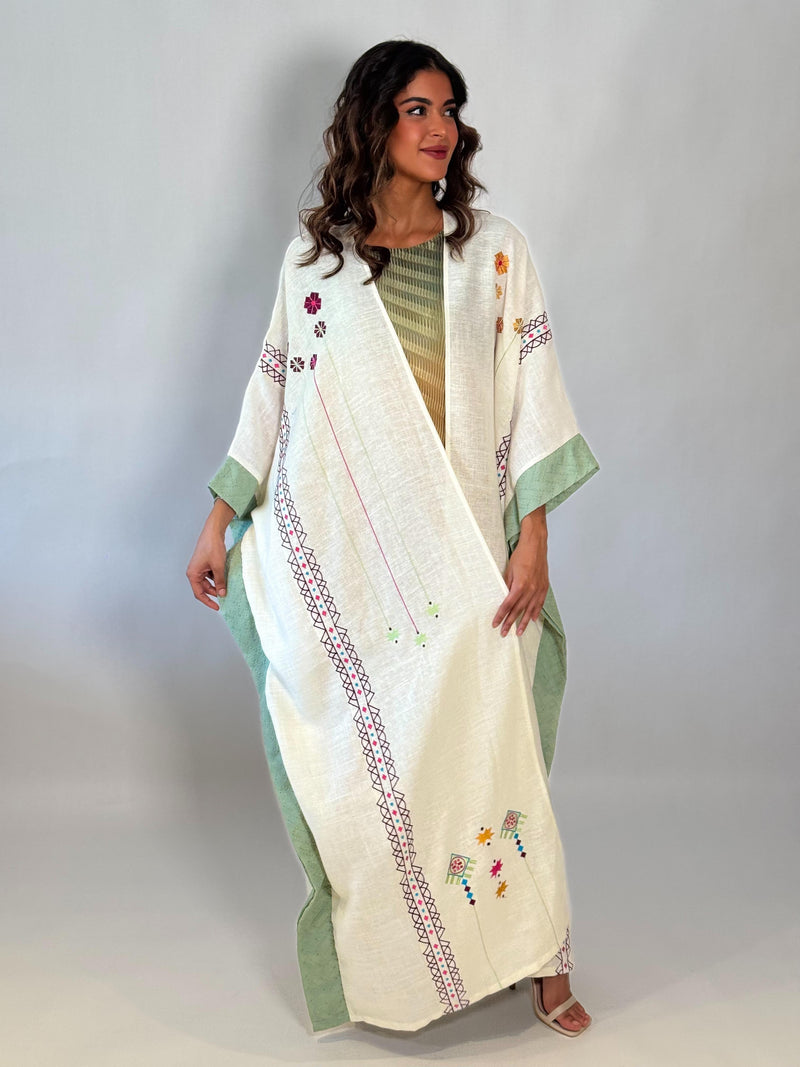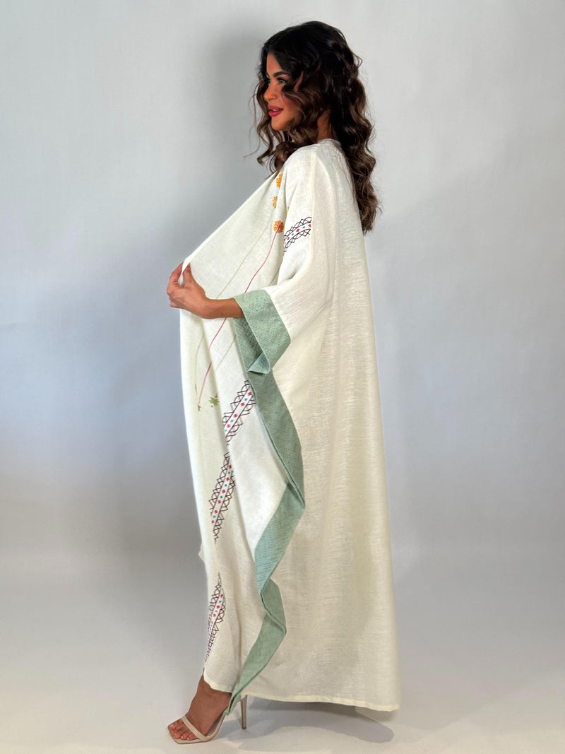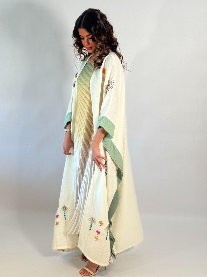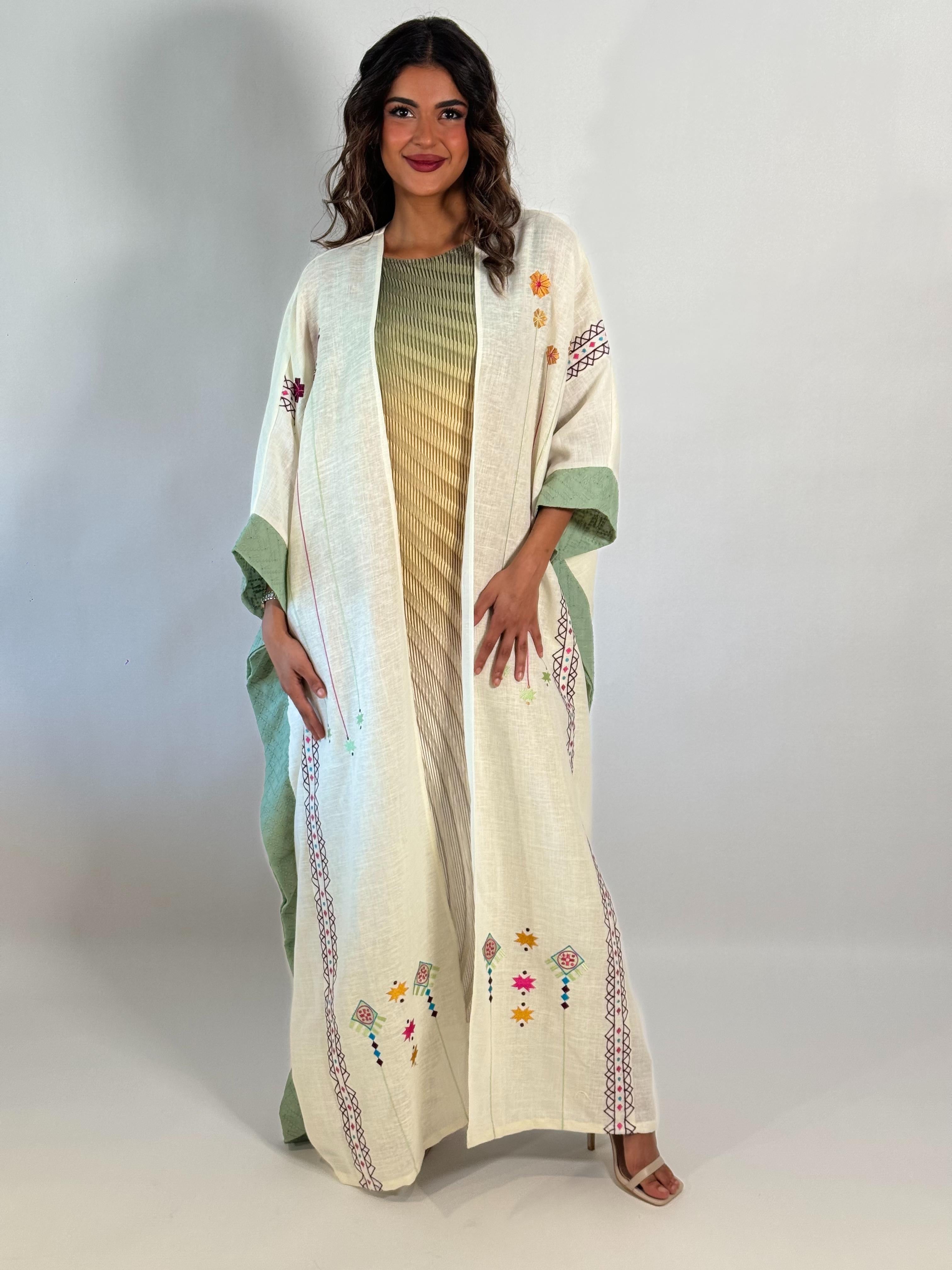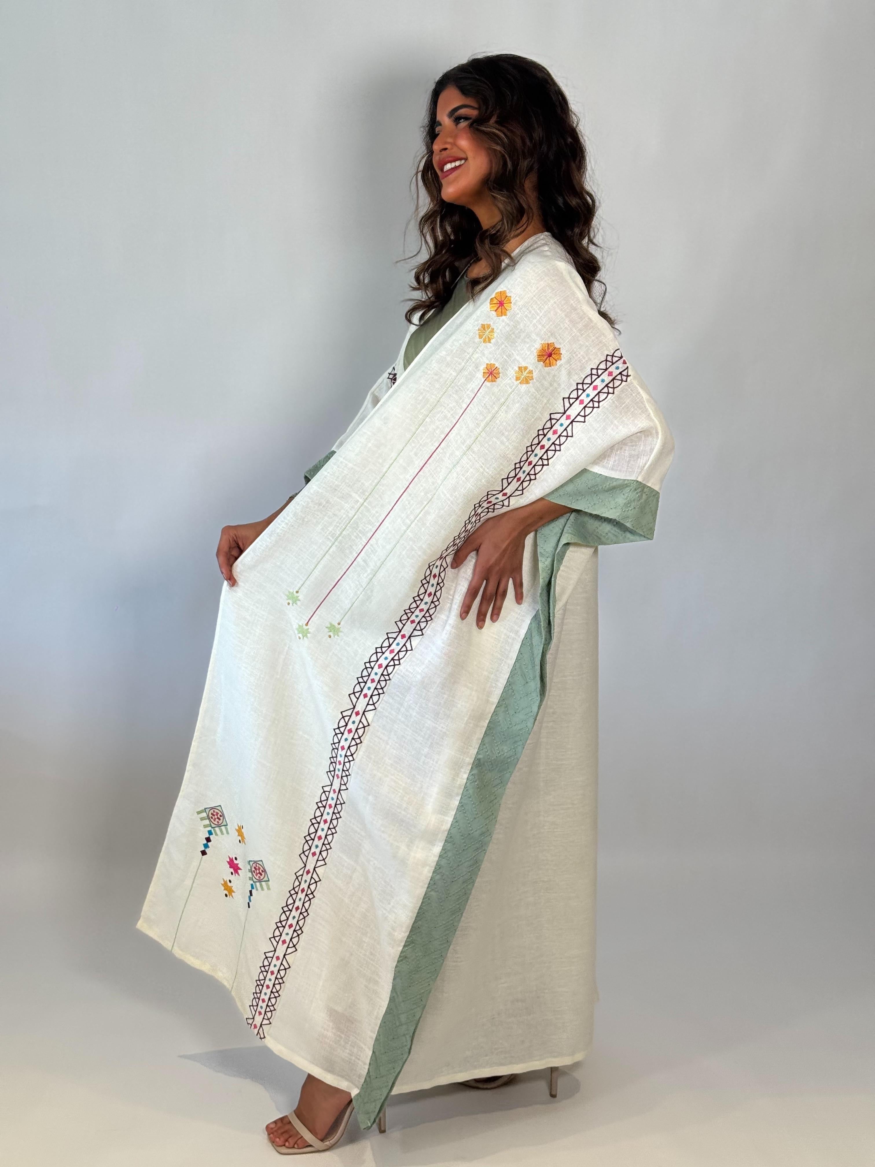 عباية فيها تفاصيل تحسسك إنك حاطة شي من مشاعرك فيها. القصّة ناعمة، والسكارف يكمل بهدوء. لبسة تقول “أنا هنا، بس براسي شي حلو.”