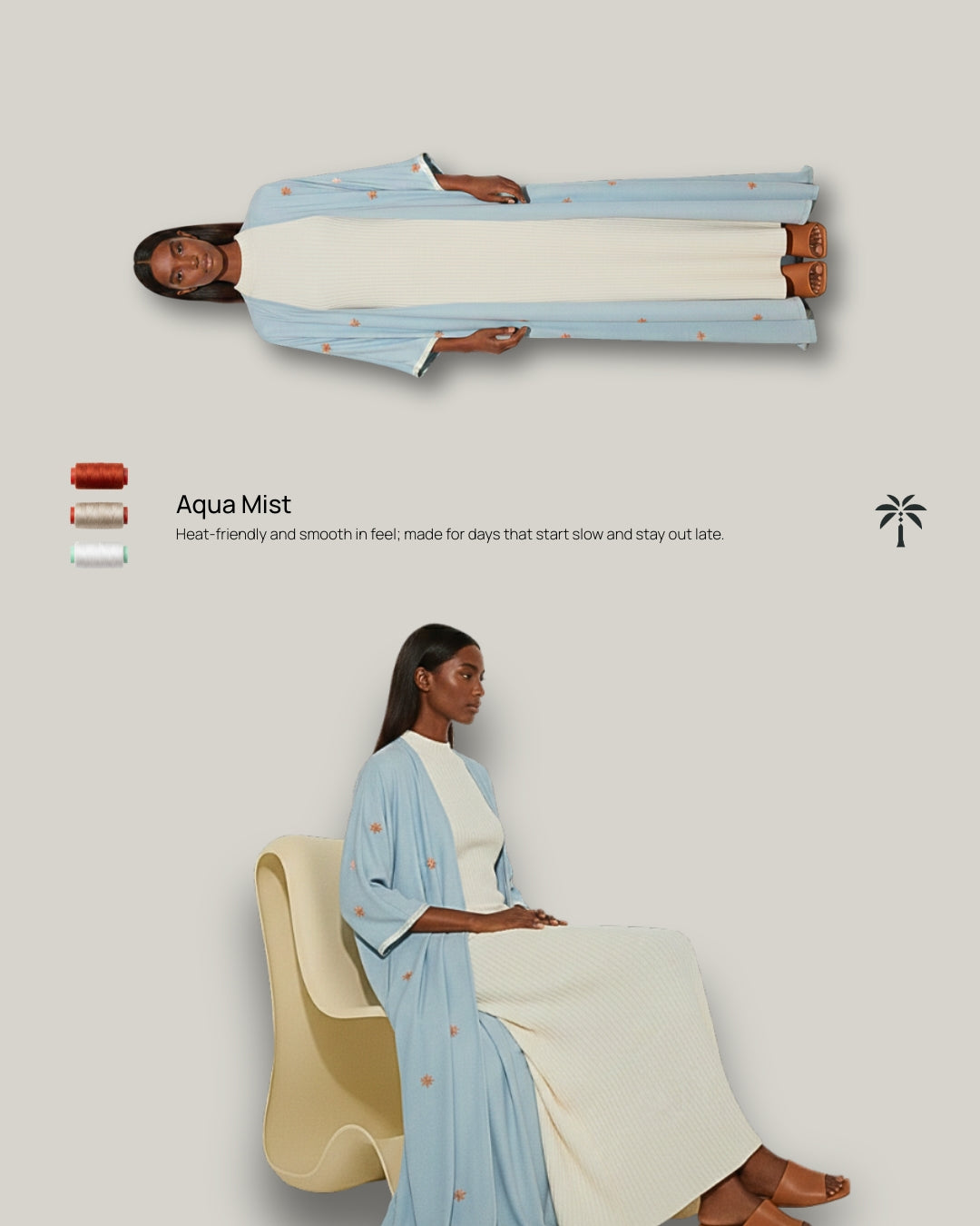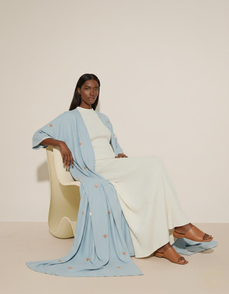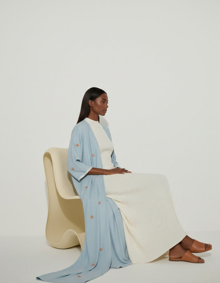 لونها يبرد، قصّتها تريح، وكلها تقول إنك طالعة مرتّبة بدون ما تفكرين كثير. الطرحة تكملها بس ما تغطي على شكلها.