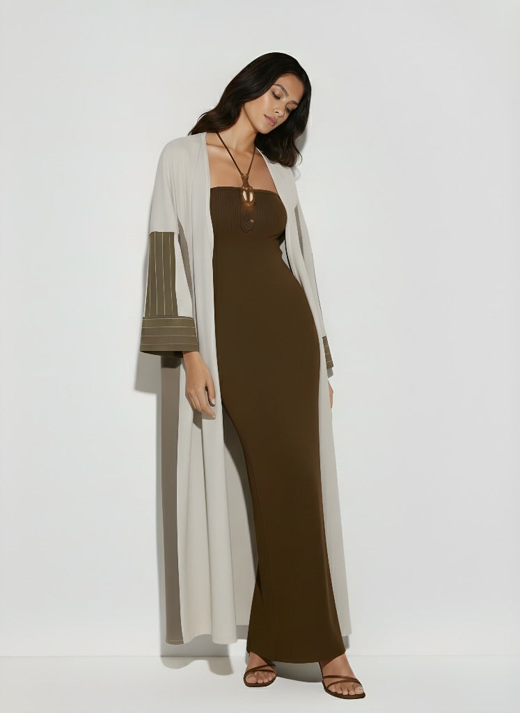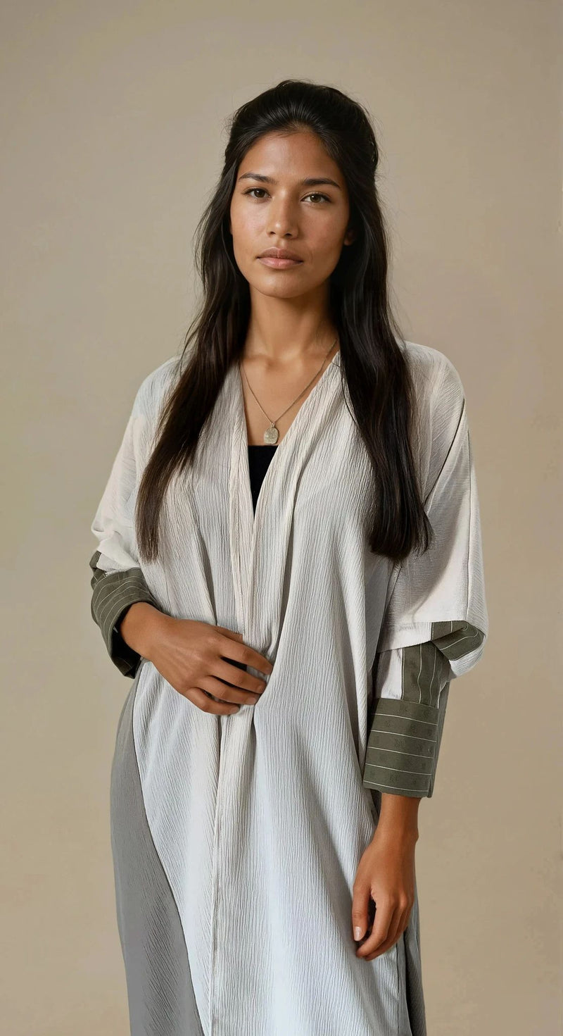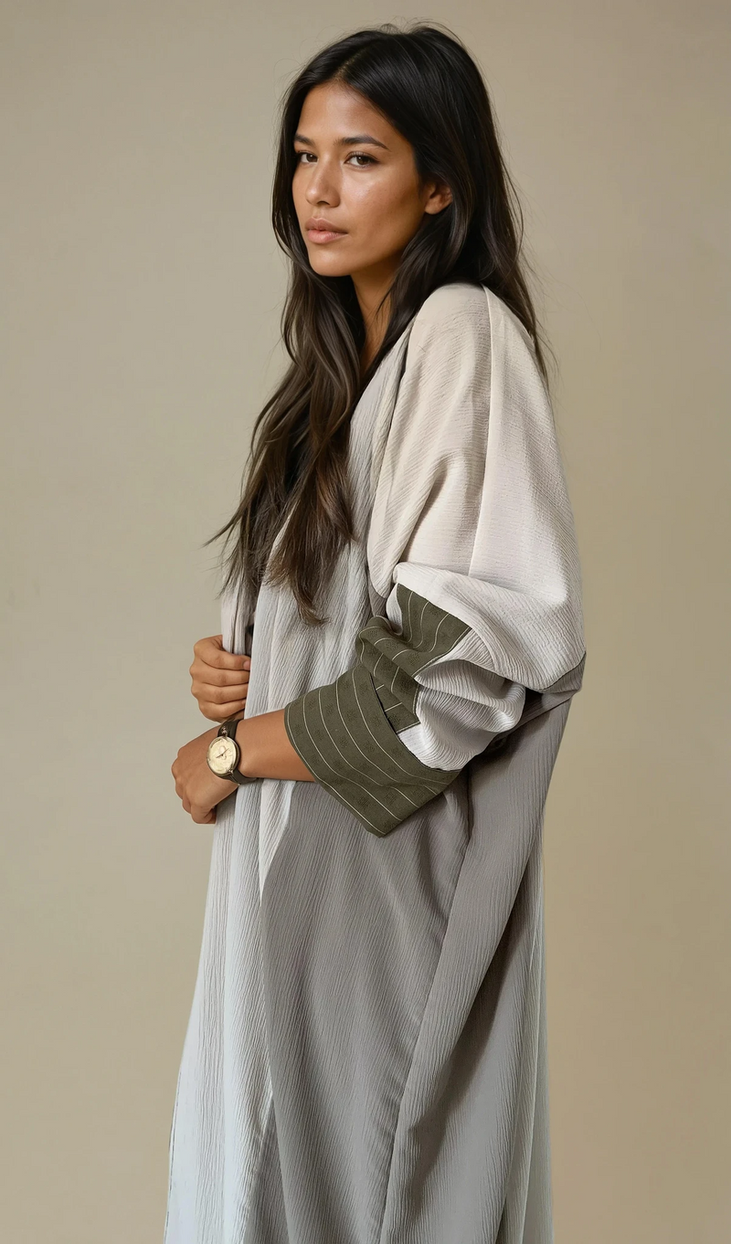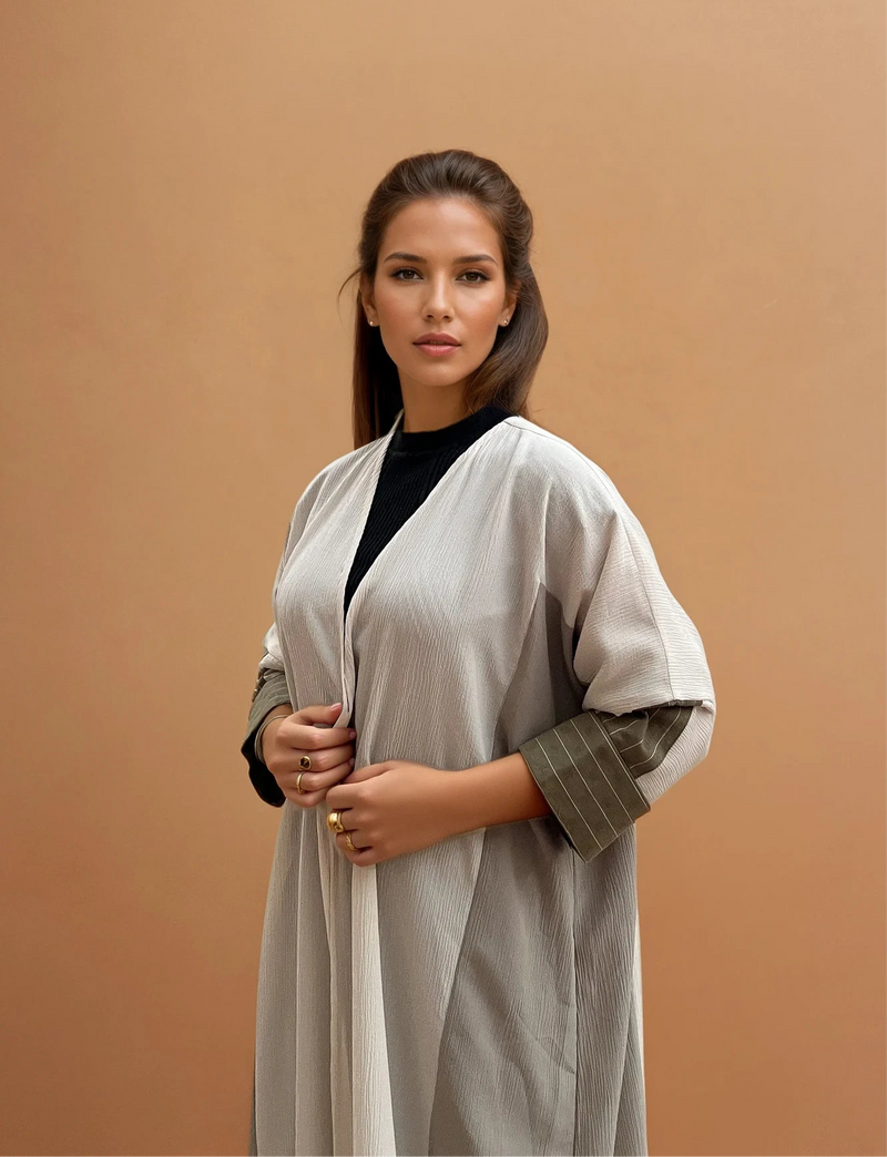 عباية ماديسون . مصممة للأيام الدافئة والرقيّ المريح، تتميز هذه العباءة بتصميمها الفضفاض المريح الذي ينساب بسلاسة على الجسم. مصنوعة من قماش خفيف الوزن يسمح بمرور الهواء، وتتناغم درجات ألوانها الكريمية الناعمة مع أطراف أكمام مخططة بلون زيتوني رقيق، مما يضفي لمسة عصرية على هذه القطعة الكلاسيكية الخالدة.