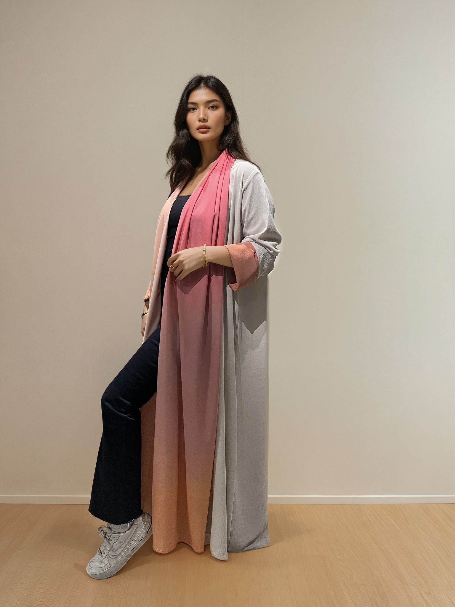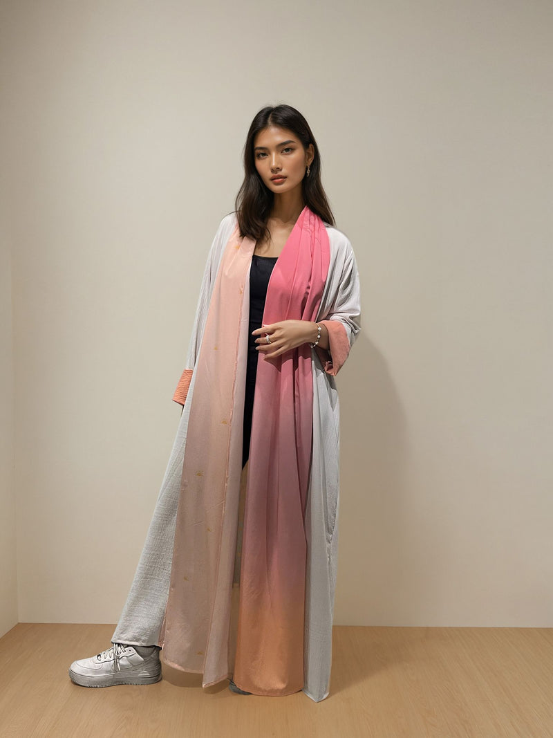 Mirage print across cotton, designed as a light abaya with presence and ease.