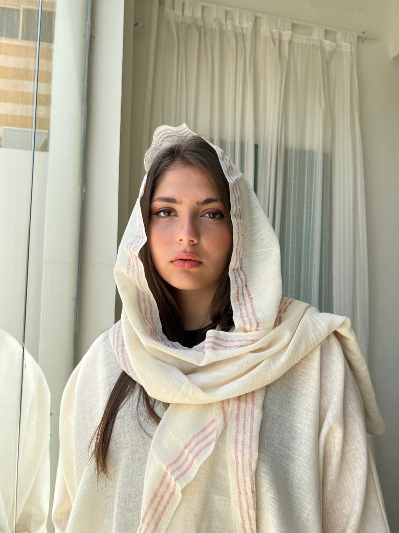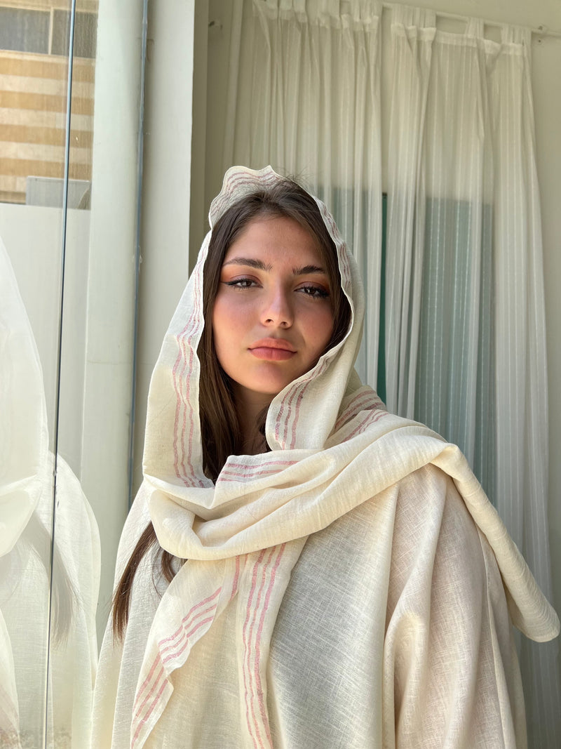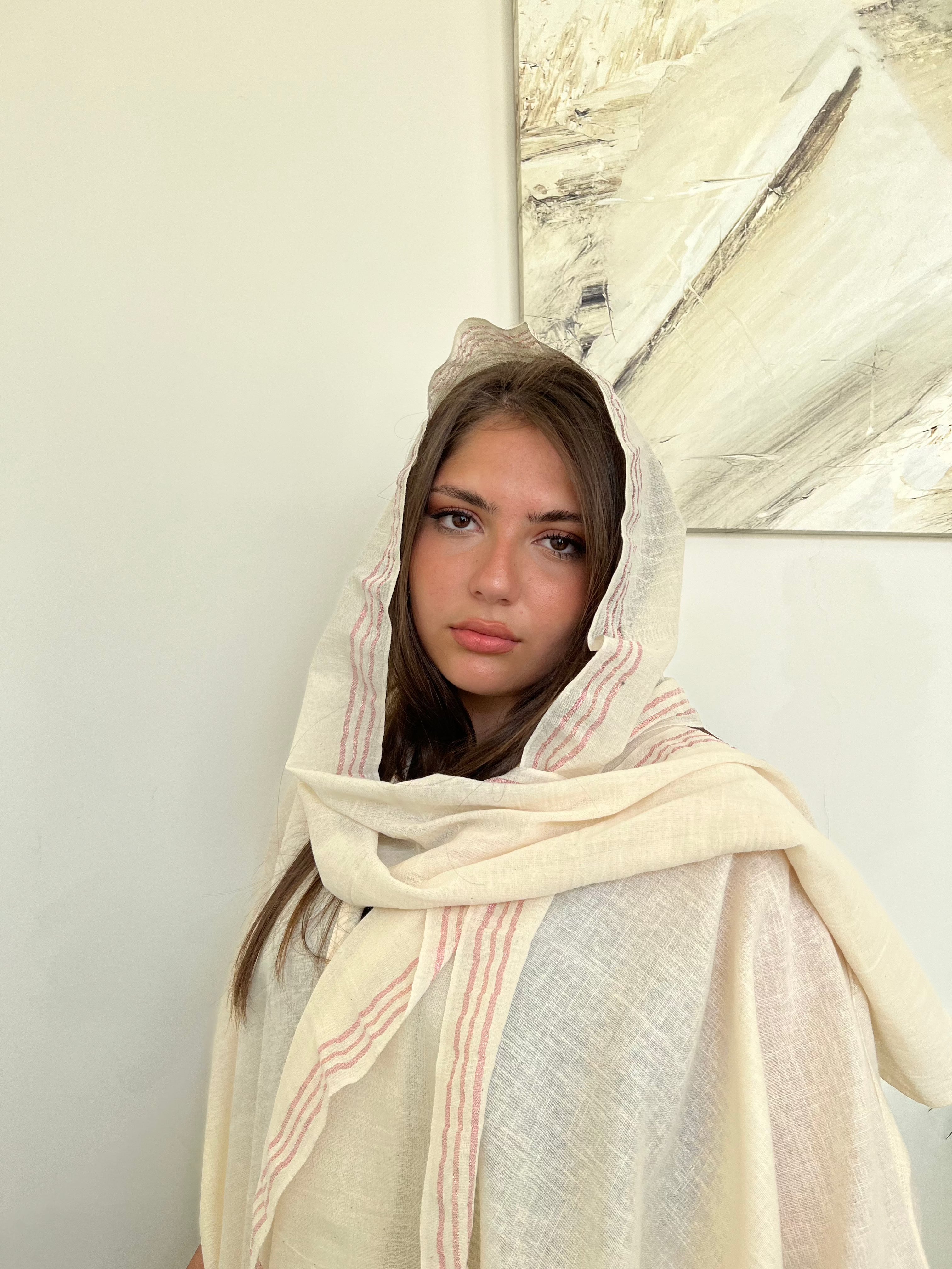 A flirty shimmer wrapped in soft linen, this pink striped scarf catches the light with every move. Lightweight, breezy, and effortlessly pretty, it's your new favorite layer for golden hour and beyond.