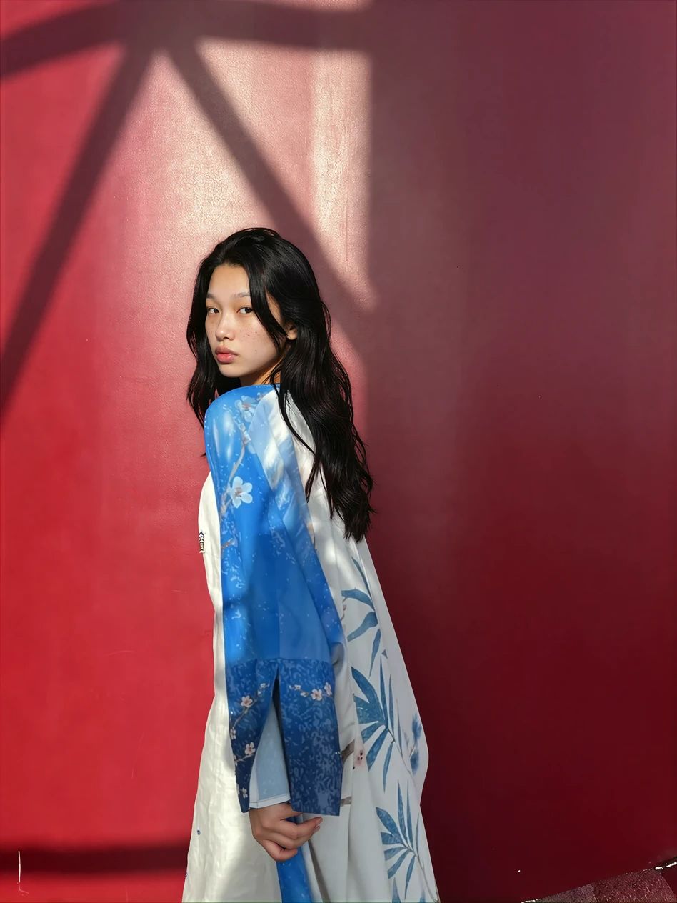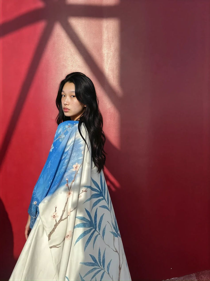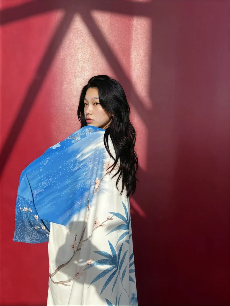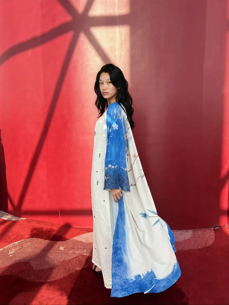 A abaya set made custom eco-blend silk, detailed with hand-drawn indigo branches and quiet blush blossoms. The print carries the calm of water and the confidence of light, fluid, certain, and grounded. It’s made for ease, whether layered, draped, or worn as its own statement.