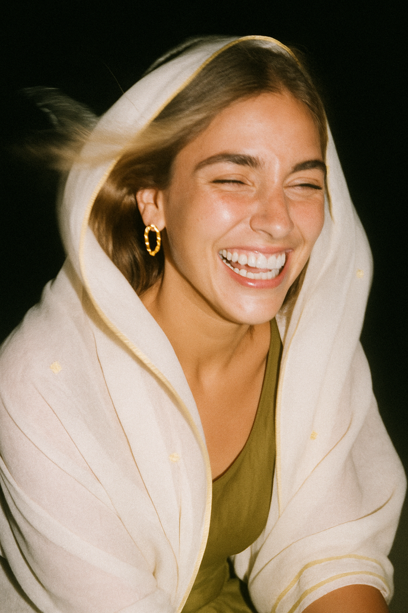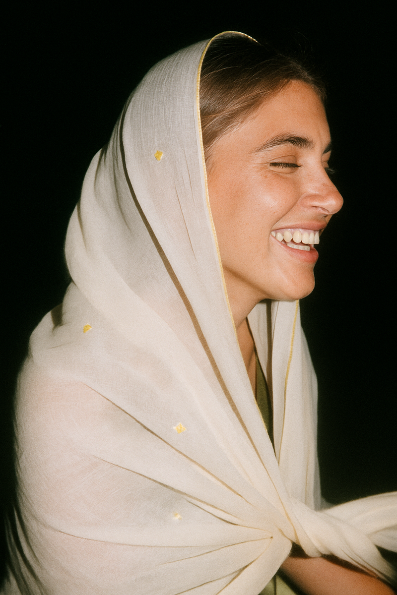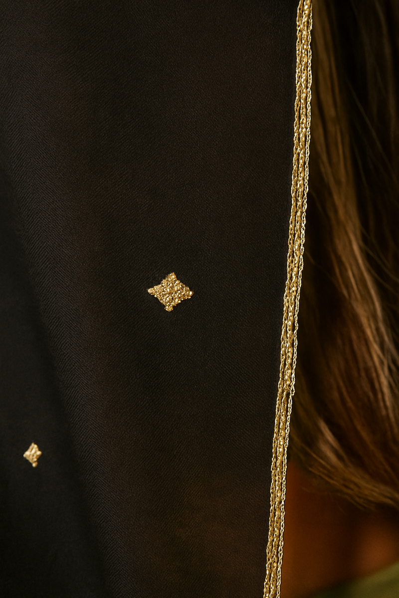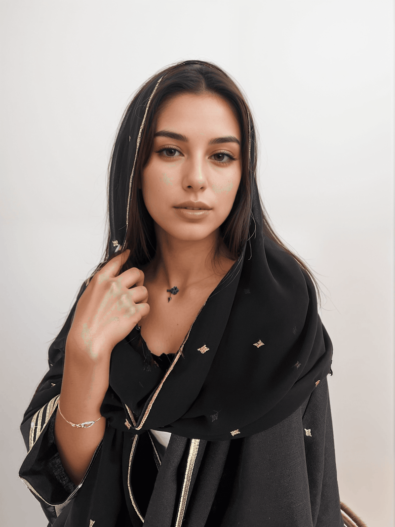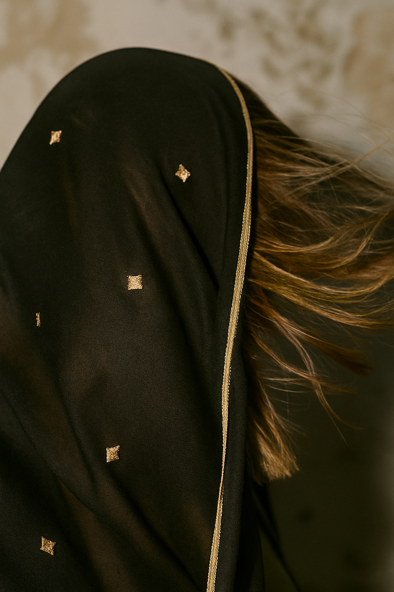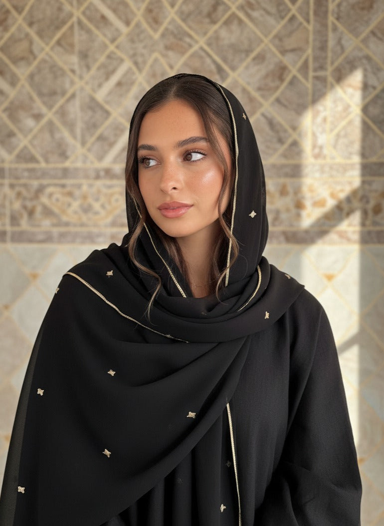 A soft shimmer moment — this scarf is dusted with delicate gold embroidered stars that catch the light just right. Pair it with our bestselling Gypsy Heart: Show Stopper Back Abaya for the ultimate glow-up.