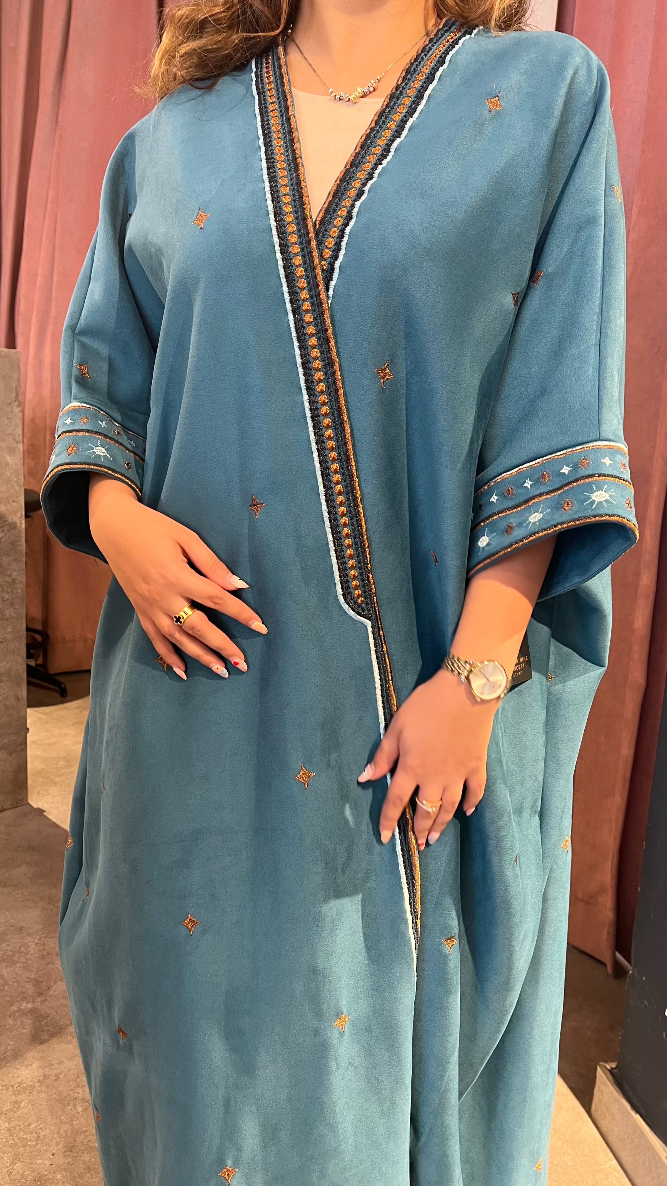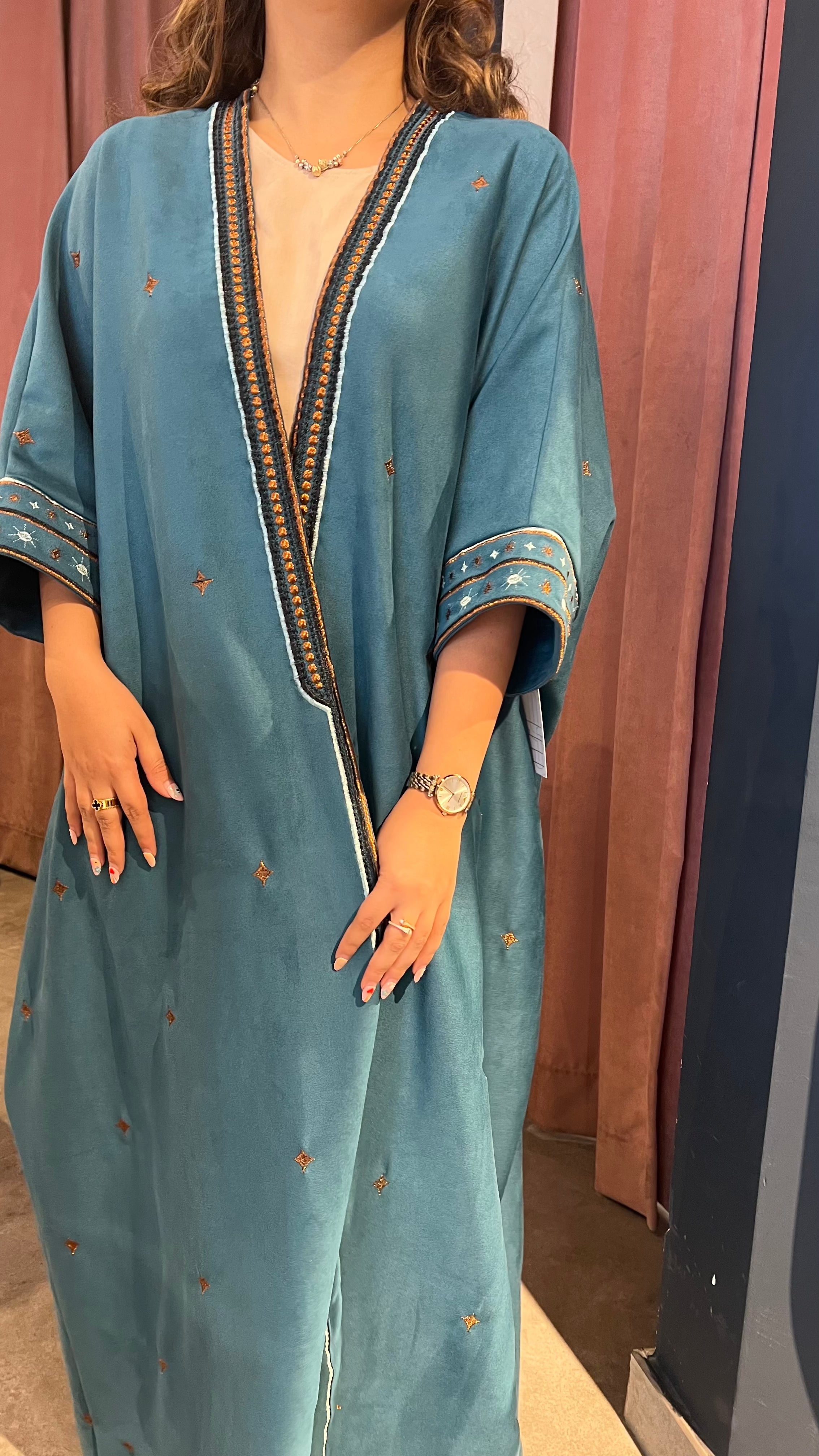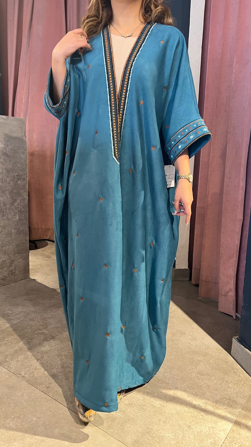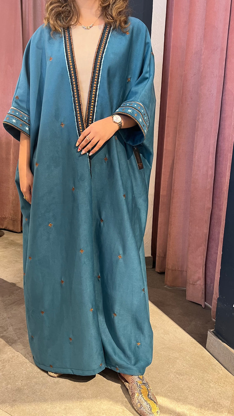 Crafted in soft suede with intricate embroidery, this winter statement piece balances warmth and elegance. Comes with a matching scarf for a refined, complete look.
