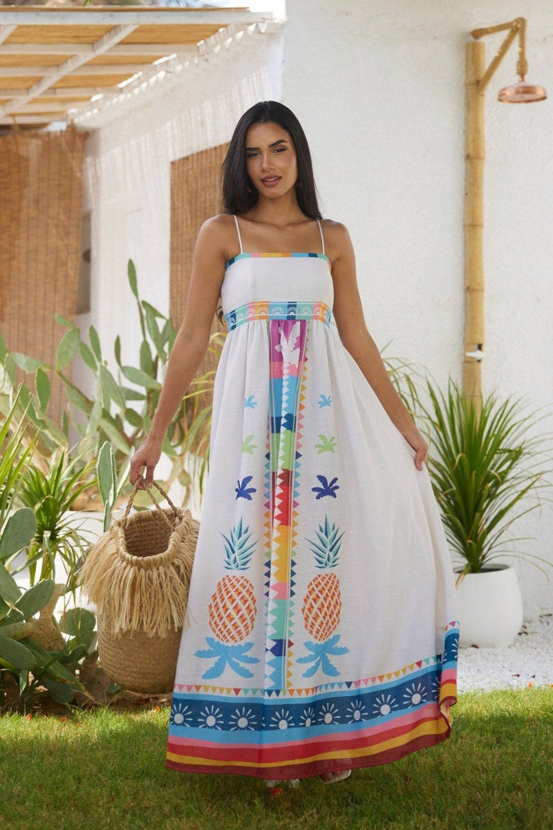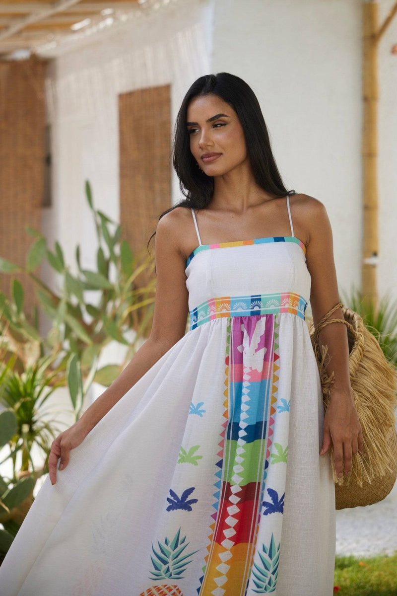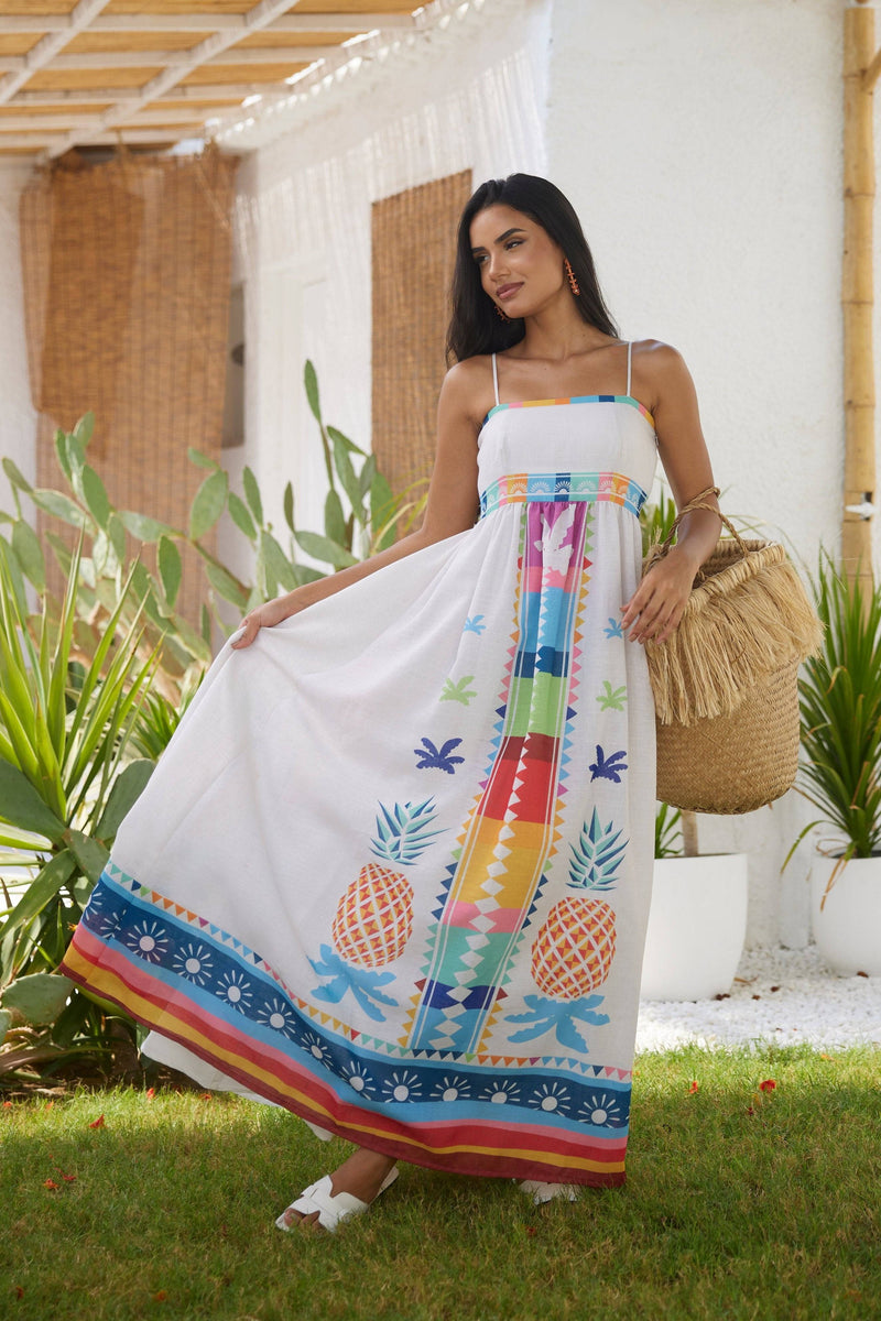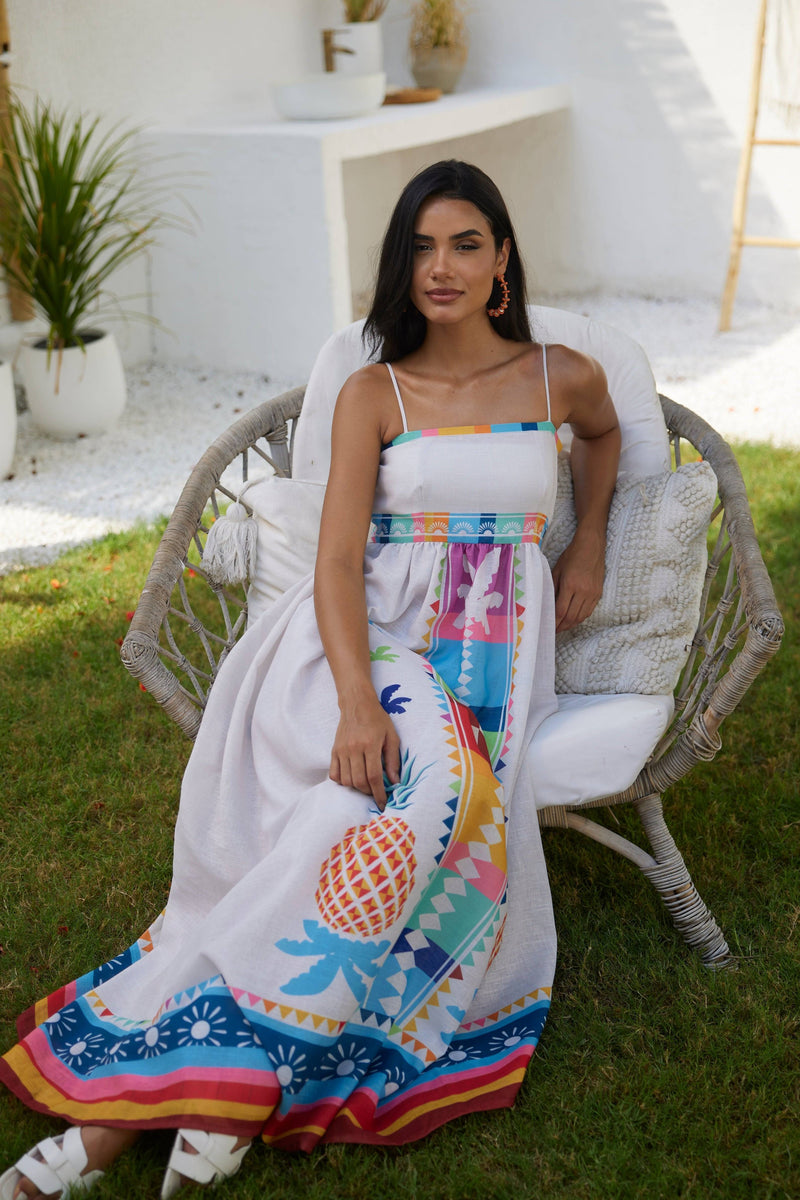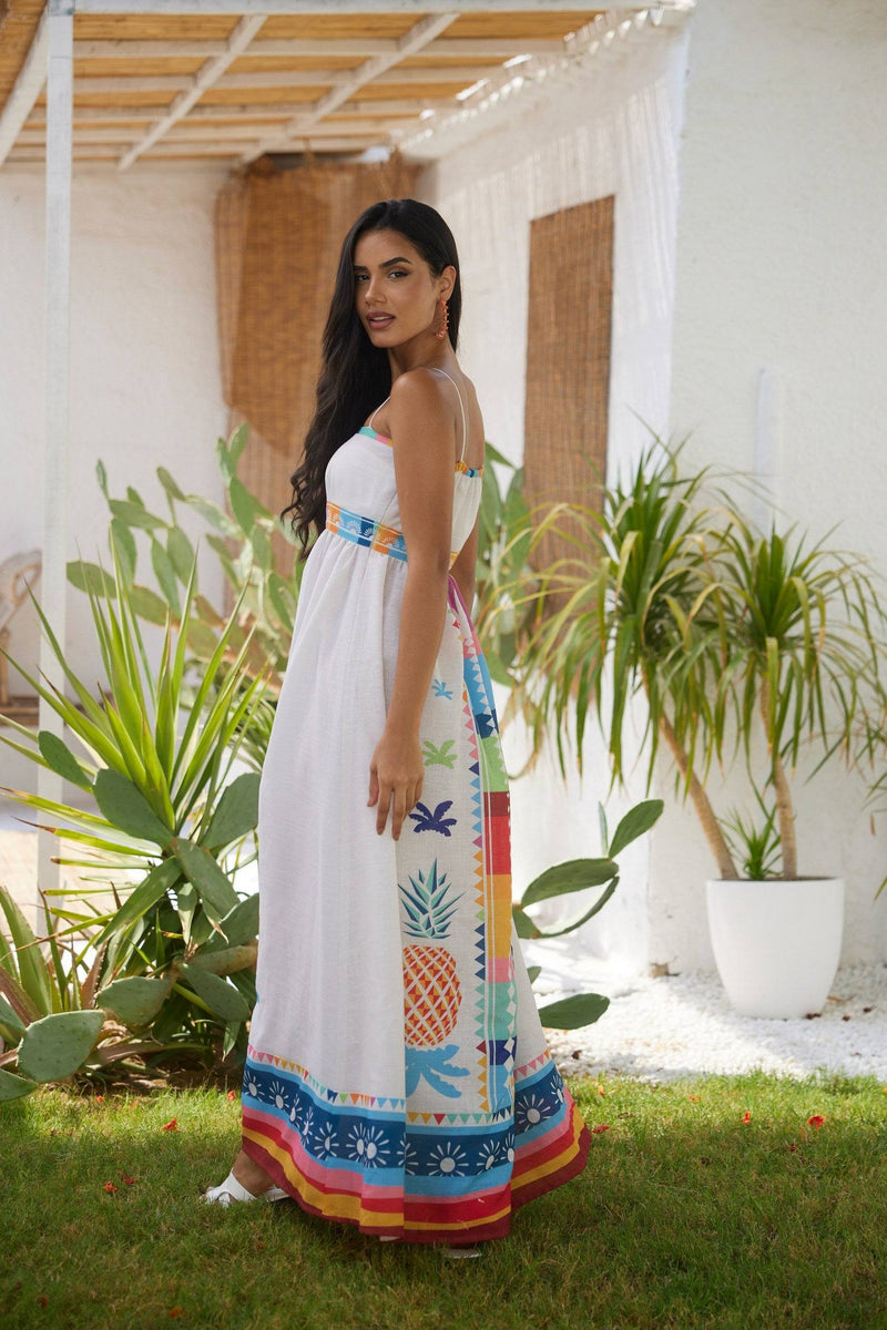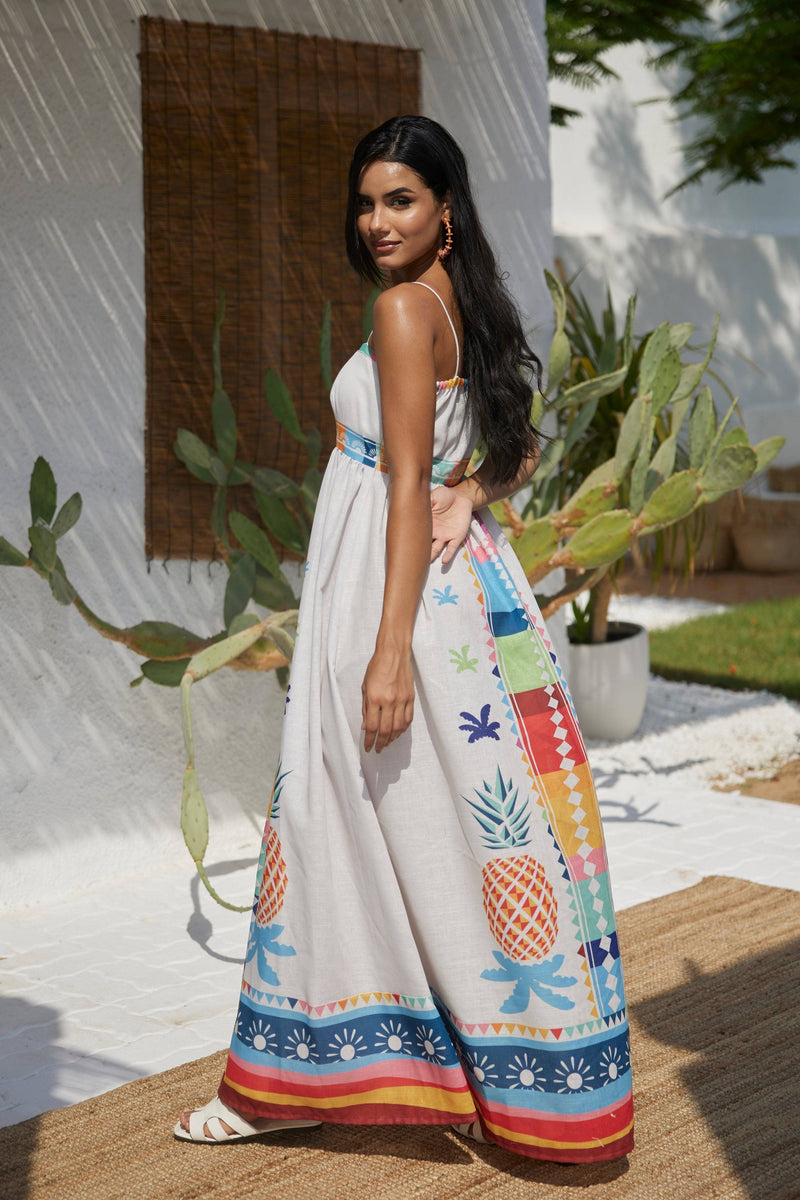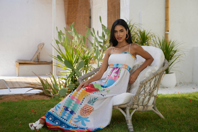 Your ultimate comfort companion for all things tropical! This dress is a burst of color and flow, featuring a lively fusion featuring pineapples and palm trees prints inspired by the vibrant cultures of Saudi Arabia and Mexico.