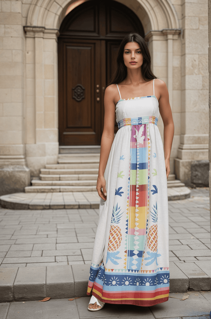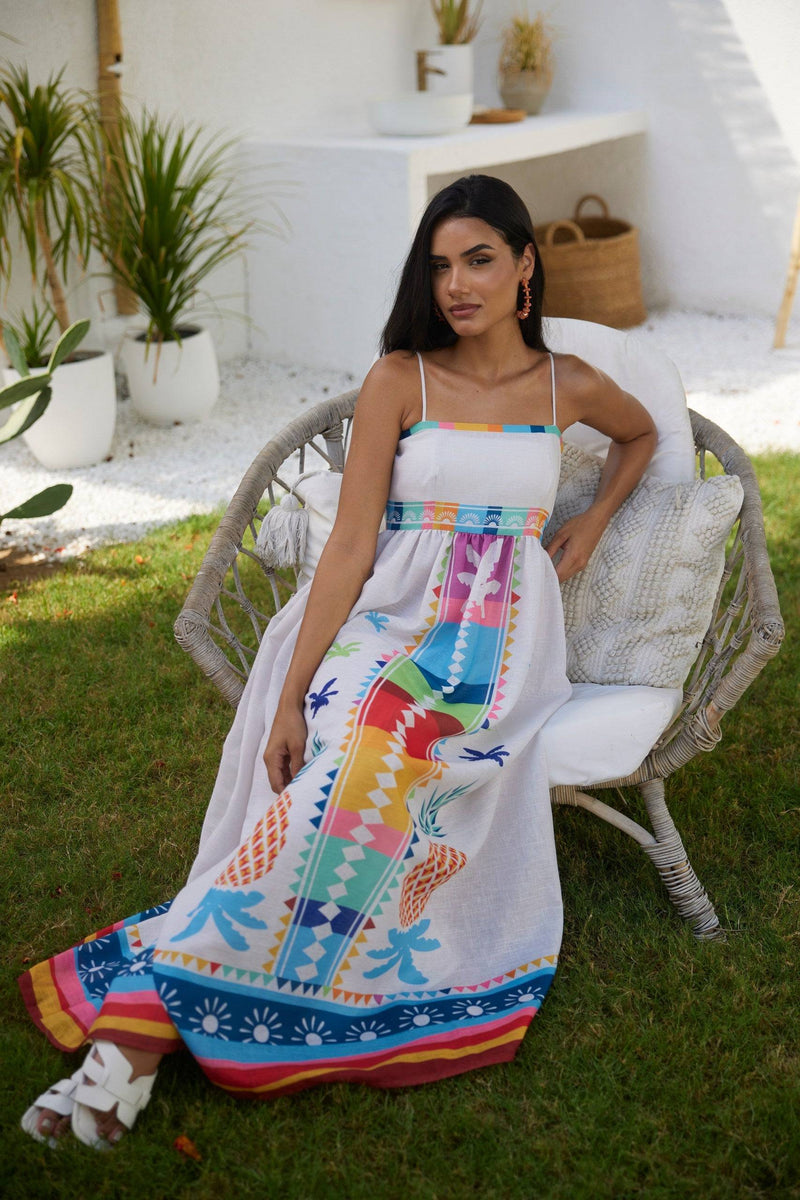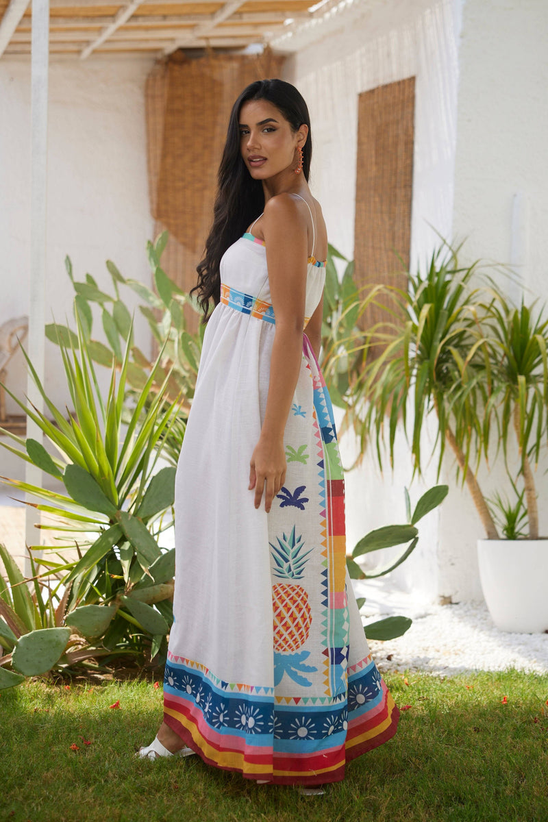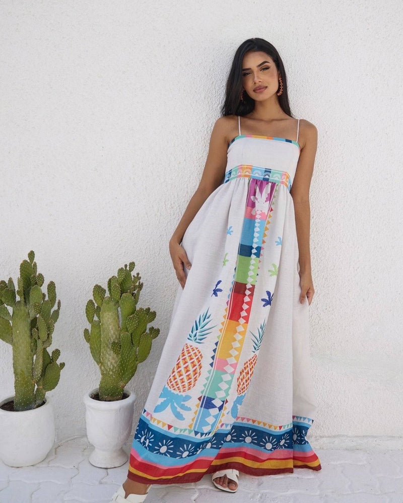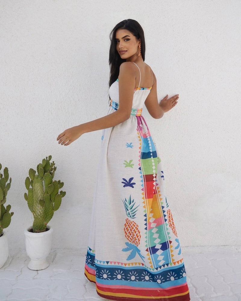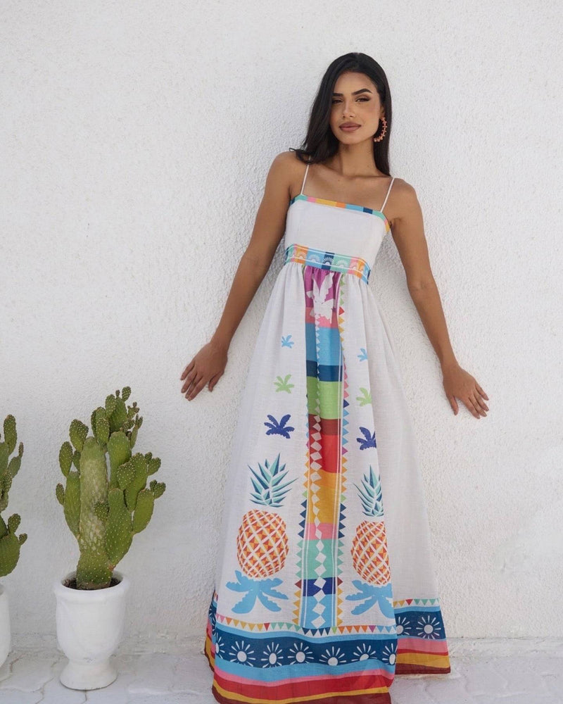 Your ultimate comfort companion for all things tropical! This dress is a burst of color and flow, featuring a lively fusion featuring pineapples and palm trees prints inspired by the vibrant cultures of Saudi Arabia and Mexico.